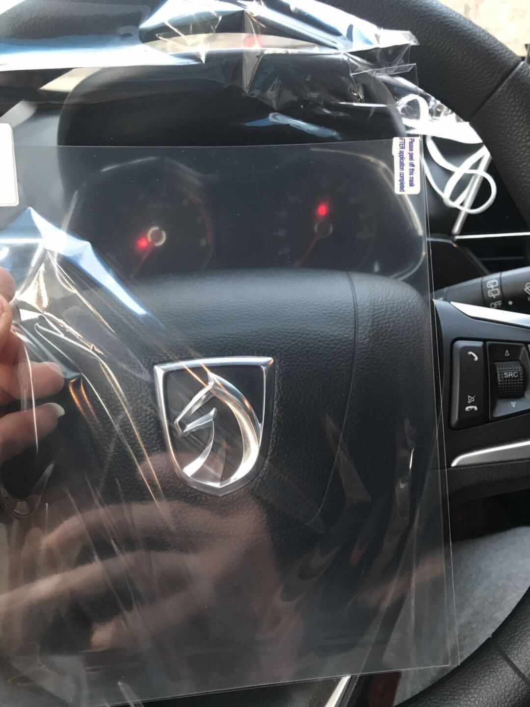 噴完以后,把1號膜撕掉一點,貼上,找好位置,然后再去車里確認一下粘貼的位置,如果位置貼的不太正,還可以修改一下,粘貼好在修改就不太好辦了。坐在車里看一下粘貼的位置合不合適,看起來正好,后視鏡正好在防雨膜的中間。
