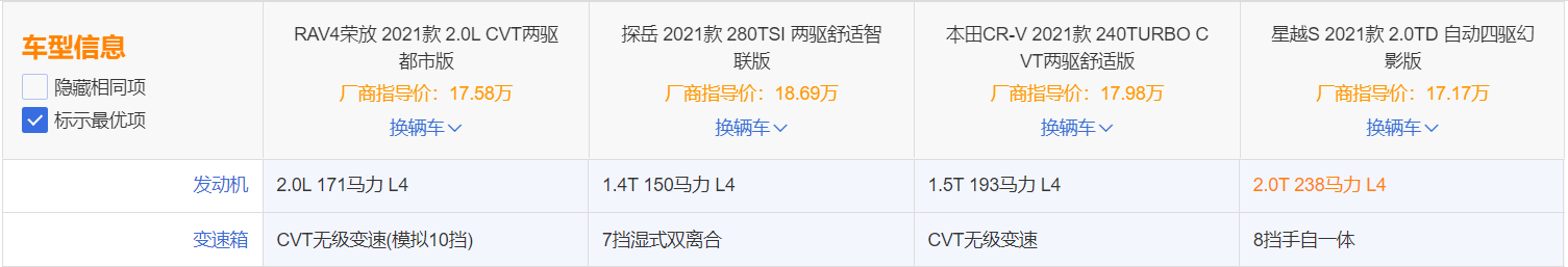榮放搭載的2.0L自吸發動機動力調教更加平順,注重燃油經濟性,最大171馬力,城市出行夠用,但跑高速超車等稍稍乏力。因為是低配版本,所以探岳沒有搭載大眾經典的2.0T+7DSG組合,只有1.4T排量,是四車中動力最弱的,因此缺點明顯,滿載時動力不那么夠用,起步油門響應比較肉,需要更久的磨合。本田CR-V搭載的1.5T發動機+CVT無極變速,最大達到193馬力,動力比探岳、榮放更寬裕,但有低速換擋頓挫,爬坡需要深踩油門等不足之處。星越S搭載的2.0T發動機+8AT變速箱這一套黃金組合可以提供最大238馬力,是四車里不折不扣的性能冠軍,可實現零百加速6.8s的跑車級性能表現。另外,星越S還有適時四驅,不僅城市出行完全沒問題,在山地、野外的通過性和舒適性也有良好的保證,而另外三車想要擁有四驅則預算需要20萬以上。