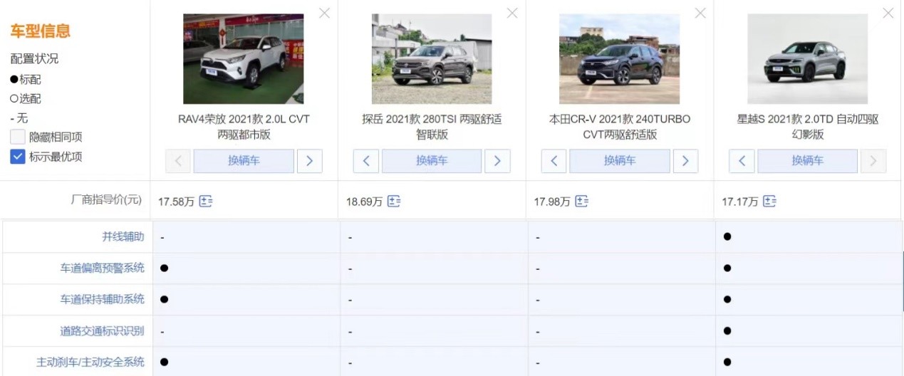 接下來是配置比較,因為不同車型配置有所不同,因此我們選取了四車價格集中在17-19萬的車型進行對比,看看哪個更具有性價比。四車對比來看,除了星越S另外三車都只是低配版本,而星越S自動四驅幻影為頂配版本。
