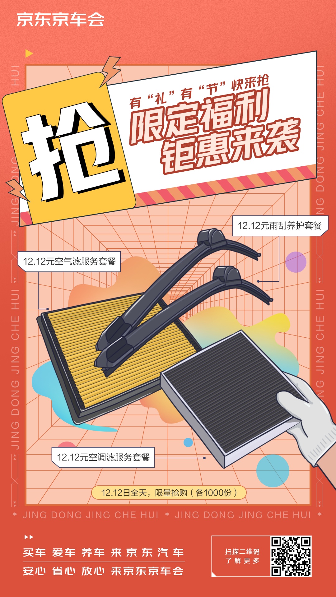 12月12日當(dāng)天,車主可限量搶購12.12元雨刮養(yǎng)護(hù)套餐、12.12元空調(diào)濾服務(wù)套餐、12.12元空氣濾服務(wù)等套餐,不玩套路,只拼手速。除此之外,還有僅需6.18元即可享受的京東京車會(huì)全年養(yǎng)車服務(wù)權(quán)益卡。更多超值優(yōu)惠,等待各位用戶前來解鎖。