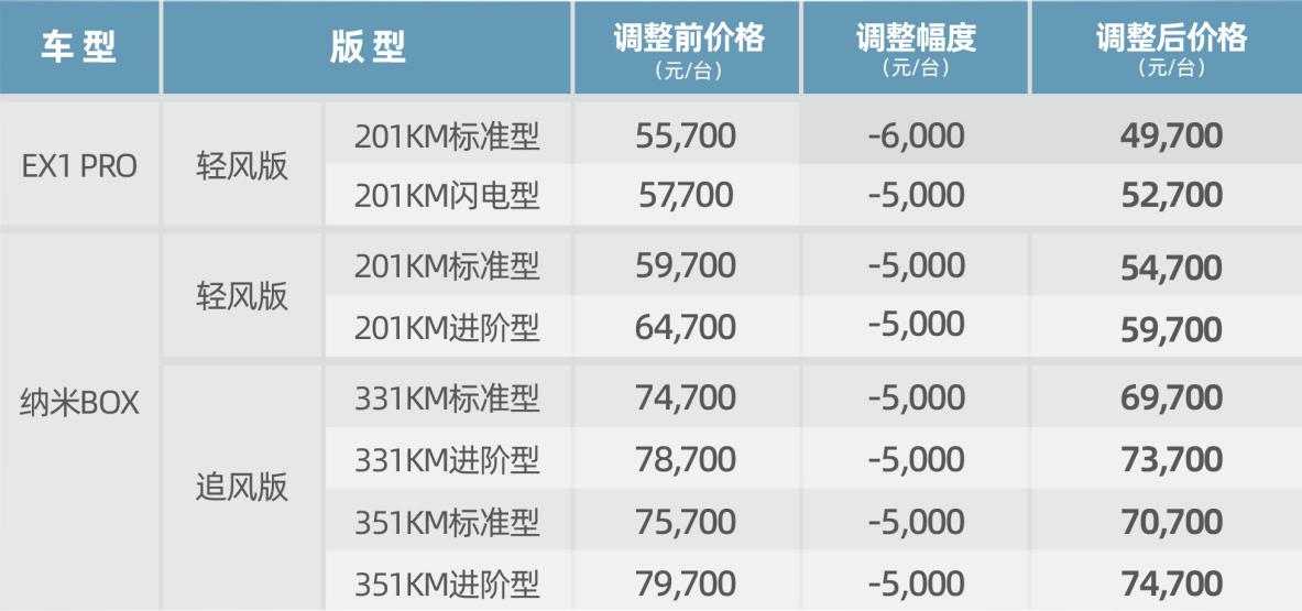 據(jù)了解,此次價(jià)格調(diào)整涵蓋東風(fēng)納米旗下EX1 PRO、納米BOX等熱銷車型,最高調(diào)整幅度達(dá)6000元。調(diào)整后,納米BOX輕風(fēng)版頂配車型的官方指導(dǎo)價(jià)降至5萬(wàn)級(jí),納米BOX追風(fēng)版331km續(xù)航版本的入手門檻也降至7萬(wàn)元以內(nèi)。