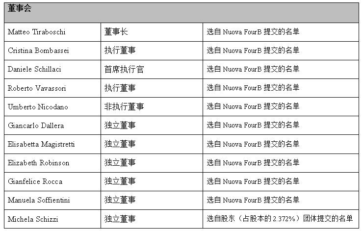 股東大會(huì)根據(jù)已提交的兩份候選人名單,特此任命新的董事會(huì),其任期直至截至2025年12月31日的年度財(cái)務(wù)報(bào)表獲批。董事會(huì)由以下組成: