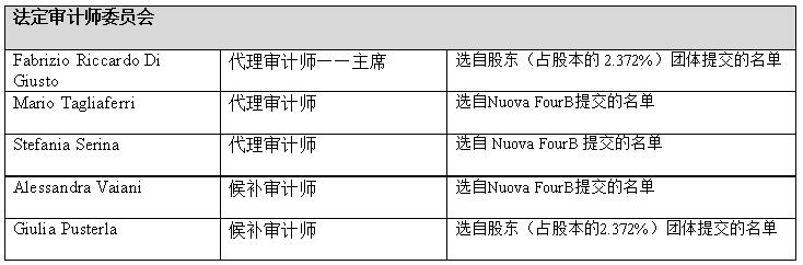 股東大會(huì)根據(jù)已提交的兩份候選人名單,特此任命新的法定審計(jì)師委員會(huì),其任期直至截至2025年12月31日的年度財(cái)務(wù)報(bào)表獲批。委員會(huì)由以下組成: