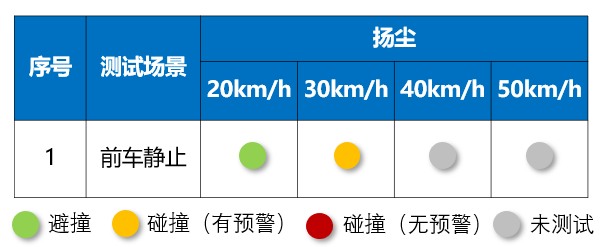 在揚(yáng)塵-前車靜止測試中,奔馳E300L在30km/h的測試中,能夠識(shí)別前方靜止車輛并在碰撞前2.2s進(jìn)行預(yù)警提示(GB/T 33577-2017《智能運(yùn)輸系統(tǒng) 車輛前向碰撞預(yù)警性能要求和測試規(guī)程》要求為大于等于0.8s),但未進(jìn)行減速避撞,該場景評(píng)分為1.9分。