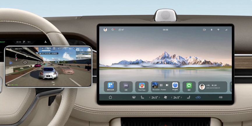 最具創新性的HUAWEI MagLink?智慧車載屏系統體驗方面,做到了華為平板無感即掛即聯,多屏交互絲滑流暢,不僅可以實現全家人一起觀影娛樂,還能打造專屬的個人工作室、會議室,靈活百變的座艙空間隨時切換。HarmonyOS支持華為手機所有視頻、游戲類應用流轉,上車后無縫連接通過觸碰車機互聯后可以接著追劇、接著玩游戲。此外鴻蒙智能座艙3.0還支持離線地圖語音導航、一鍵預約備車等實用功能,為用戶提供了更加舒適、便捷的出行體驗。