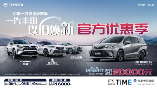 不止如此,一汽豐田還公布了“以舊煥新官方優惠季”的開啟信息,全面響應國家政策,在原有優惠基礎上加碼增新,4月25日-5月10日,2024款格瑞維亞尊享20000元限時權益,一汽豐田全車系可享至高8年0首付起、36期0利率、505 彈性金融方案等多重金融政策,及至高16000元的置換補貼,助力用戶輕松開啟高品質出行生活。展示出一汽豐田作為央企合資企業,賦能中國汽車行業實現高質量發展的責任與擔當。