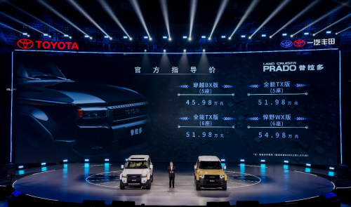 此次發布會上,備受關注的全新普拉多也正式發布官方指導價,新車包含:穿越BX版(5座):45.98萬元:全能TX版(5座):51.98萬元、全能TX版(6座):51.98萬元、悍野WX版(6座):54.98萬元,四大版本覆蓋了硬派越野從個性化、時尚化再到高端化等不同細分市場。同時,一汽豐田還推出官方聯名改裝商品線“上新了!PRADO”,首批官方改裝套件的探索套裝、精英套裝和蒙娜麗莎套裝也正式開啟預售,供用戶從心而選。