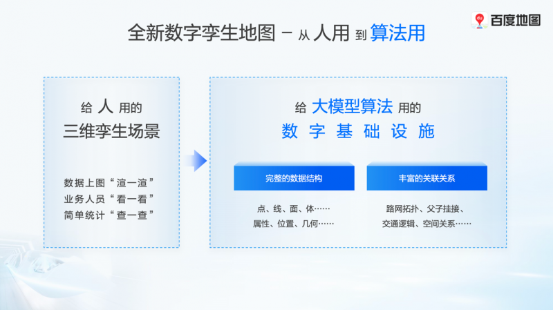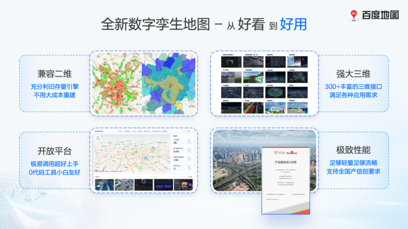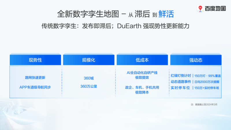 2024年7月30日,百度地圖正式推出新一代數(shù)字孿生地圖DuEarth,重新定義了數(shù)字孿生地圖:不僅好看,更要好用;不僅給人看,還要給大模型算法用;不再是更新滯后的模型堆砌,而要用超低成本保持?jǐn)?shù)字孿生地圖的鮮活,讓數(shù)字孿生地圖路網(wǎng)實(shí)現(xiàn)和百度地圖APP車道級(jí)導(dǎo)航的同步更新——具備“更好用、更智能、更鮮活”三大亮點(diǎn)。