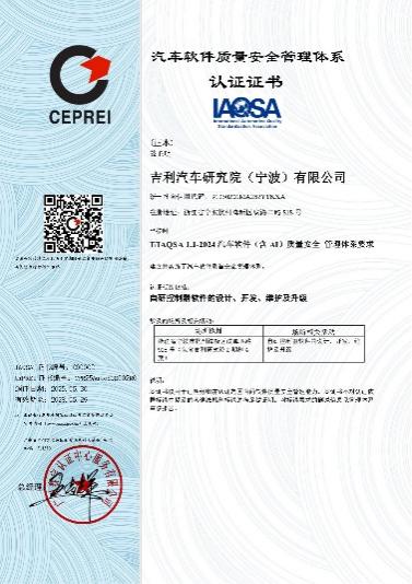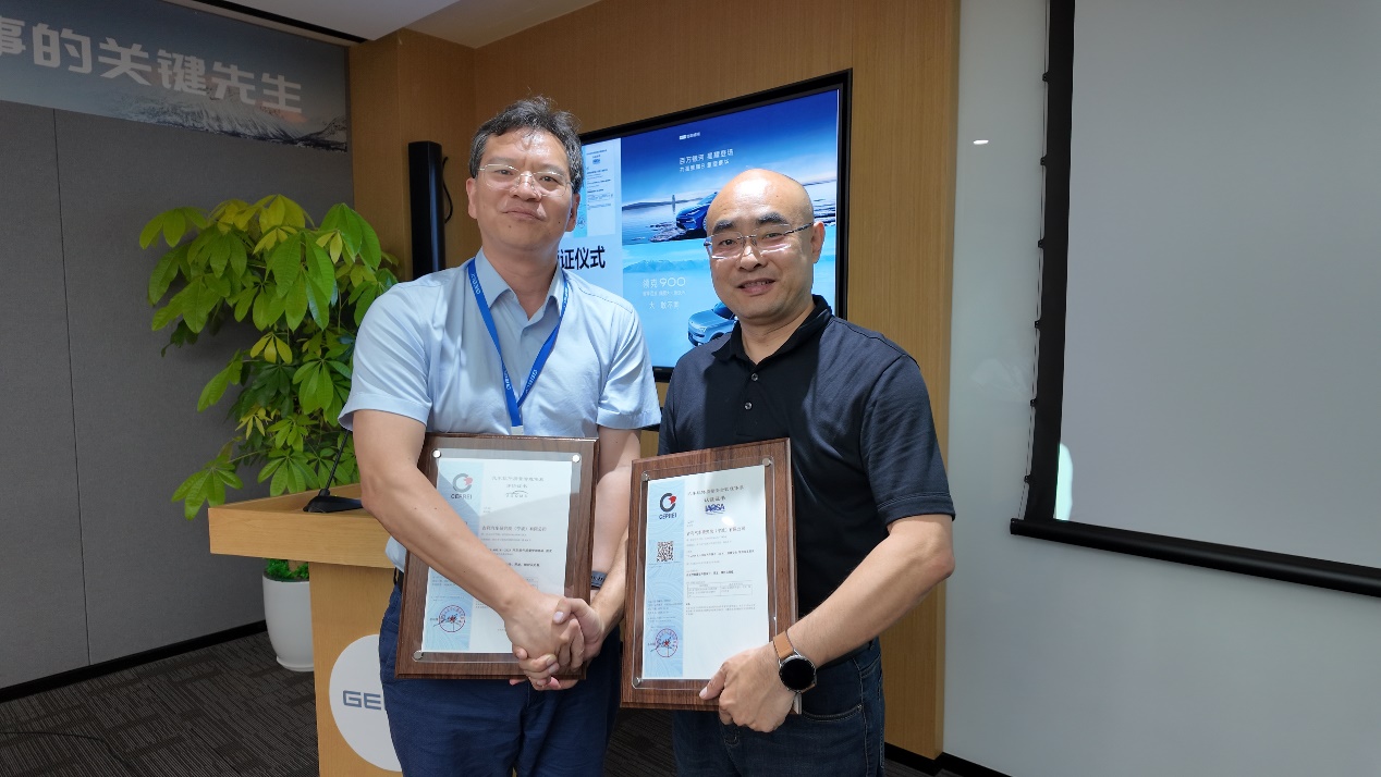 2025年6月23日,由賽寶認證中心向吉利汽車研究院授予的“汽車軟件質量管理體系標準(ASQMS)”和“汽車軟件(含 AI)質量安全管理標準(AUTOSQS)”證書頒發(fā)儀式在寧波杭州灣吉利汽車研究院舉行。