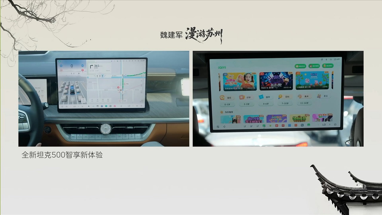 針對全家人的座艙娛樂需求,全新坦克500實現車內6屏交互,包括行業最薄15.6英寸2.5K超高清中控大屏、17.3英寸3K吸頂超大娛樂屏、12.3英寸全彩數字虛擬組合儀表、HUD抬頭顯示、流媒體內后視鏡、后排扶手屏,支持三指滑屏傳屏與應用共享,滿足全家信息交互需求。系統還預裝了深度定制的QQ音樂、網易云音樂、愛奇藝、喜馬拉雅APP,搭配Coffee AI Sound咖啡智能音響系統,讓全家人的旅途娛樂不停歇。