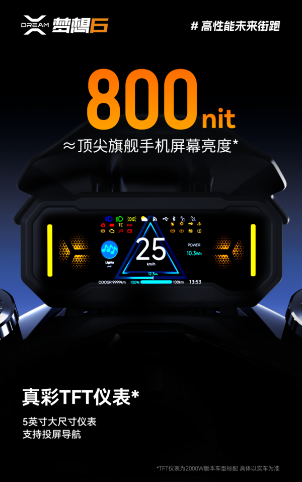 新日夢想6,正是為駕馭全場景而生。搭載峰值2000w雙磁路電機,極速可達80km/h+,堪稱兩輪世界的“速度與激情”完美演繹者。 早高峰踩點出發(fā),亦無懼遲到,輕擰轉速把,瞬間爆發(fā)強勁推背感,一騎絕塵。前31芯大管徑+后五級可調節(jié)減震的配置,即使在面對泥濘小路、坑洼路面、起伏不定的砂石路的情況下亦能如履平地,暢行無阻。即便是行駛在陡峭的坡道上,也能穩(wěn)健通行,絲毫不影響其馭風前行的速度。憑借強勁性能,新日夢想6游刃有余,可城可野,盡顯全能本色。