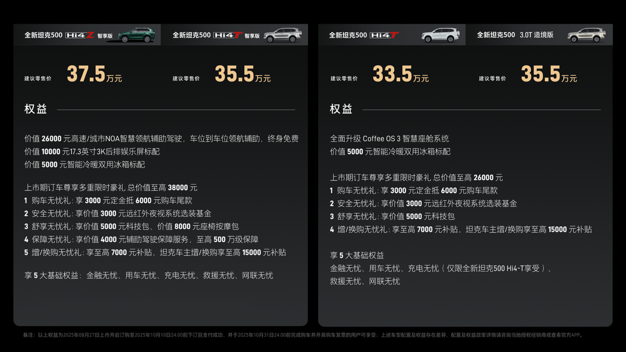 2025年8月2日,全新坦克500以33.5萬—37.5萬元價格區間正式上市,僅2小時便收獲12257輛大定鎖單,坦克品牌憑借全面領先的產品實力,證明了硬派越野在中國同樣有廣闊天地。全新坦克500以“全場景智能豪華越野SUV”之名,再進化、再定義,開啟越野新時代。