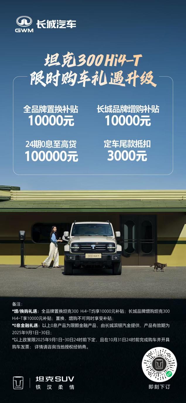 坦克300 Hi4-T憑借其經典方盒子造型、強悍越野性能與豪華智能配置的完美融合,不僅贏得了眾多越野愛好者的青睞,更成為都市潮流人群彰顯個性的時尚座駕。為滿足廣大用戶需求,九月訂購坦克300 Hi4-T,可享以下超值權益: